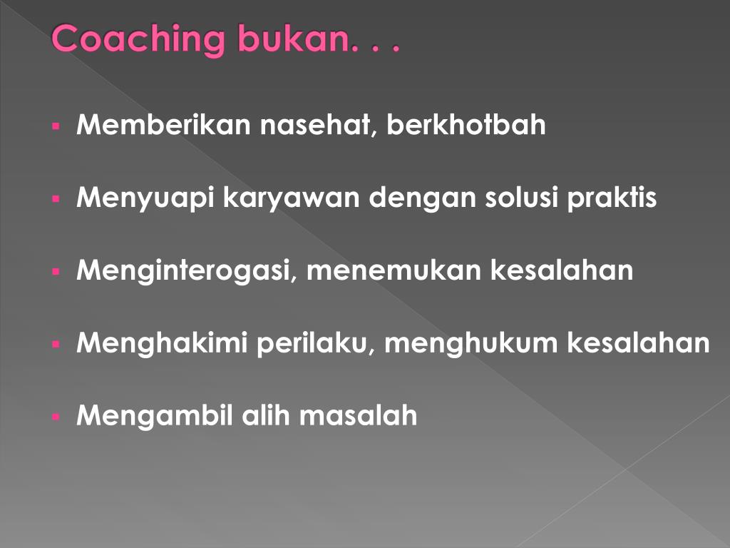 Coachingbukan. . . • Memberikan nasehat, berkhotbah • Menyuapi karyawan dengan solusi praktis • Menginterogasi, menemukan kesalahan • Menghakimi perilaku, menghukum kesalahan • Mengambil alih masalah