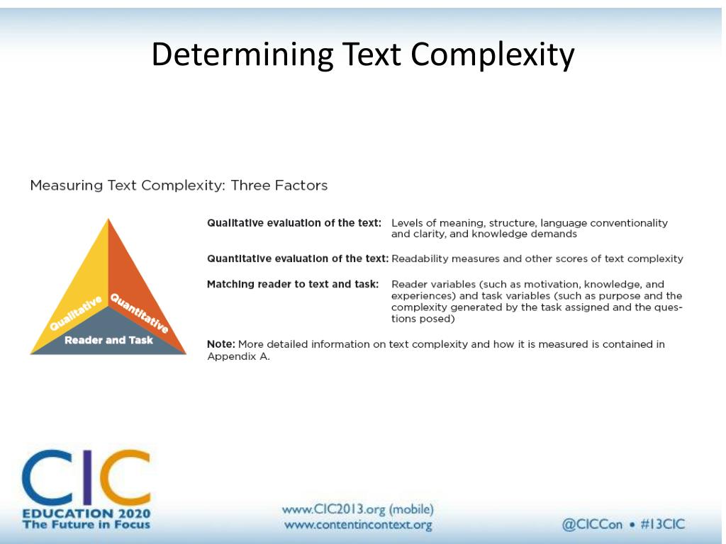 Determining Text Complexity • Run each passage through a quantitative analyzer tool and determine its ratings. • Use the Common Scale to determine its placement in a particular band. • Use qualitative measures (Structure, Language and convention, Knowledge demands, Level of meaning/process) to place a text in a specific grade. (tools available on www.achievethecore.org ) • Exceptions: • At times, qualitative measures will trump the quantitative measures (narrative fiction). • For drama and poetry, only qualitative measures can be used.