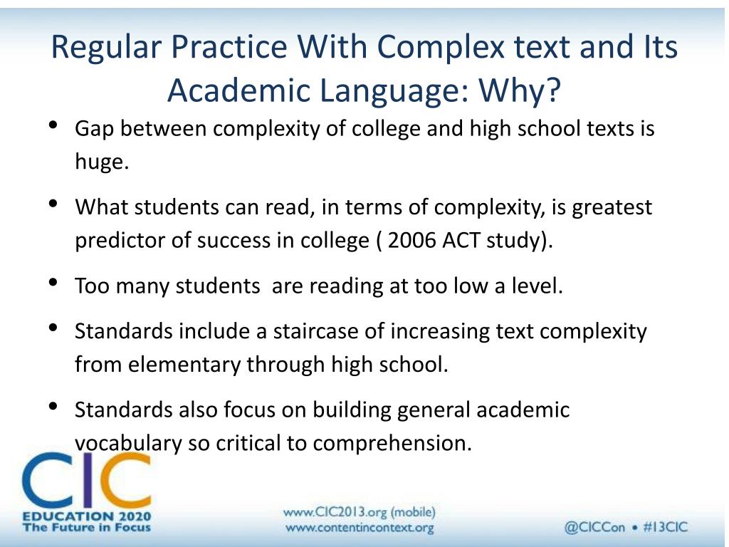 Regular Practice With Complex text and Its Academic Language: Why? Gap between complexity of college and high school texts is huge. What students can read, in terms of complexity, is greatest predictor of success in college ( 2006 ACT study). Too many students are reading at too low a level. Standards include a staircase of increasing text complexity from elementary through high school. Standards also focus on building general academic vocabulary so critical to comprehension.