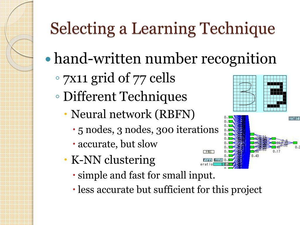 Selecting a Learning Technique • hand-written number recognition • 7x11 grid of 77 cells • Different Techniques • Neural network (RBFN) • 5 nodes, 3 nodes, 300 iterations • accurate, but slow • K-NN clustering • simple and fast for small input. • less accurate but sufficient for this project