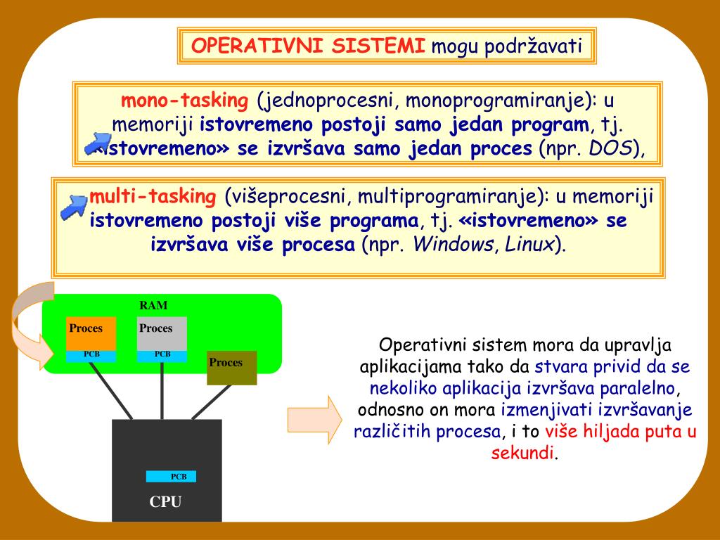 mono-tasking(jednoprocesni, monoprogramiranje): u memoriji istovremeno postoji samo jedan program, tj. «istovremeno» se izvršava samo jedan proces (npr. DOS), multi-tasking(višeprocesni, multiprogramiranje): u memoriji istovremeno postoji više programa, tj. «istovremeno» se izvršava više procesa (npr. Windows, Linux). RAM Proces Proces Proces PCB PCB PCB CPU OPERATIVNI SISTEMI mogu podržavati Operativni sistem mora da upravlja aplikacijama tako dastvara privid da se nekoliko aplikacija izvršava paralelno, odnosno on mora izmenjivati izvršavanje različitih procesa, i to više hiljada puta u sekundi.