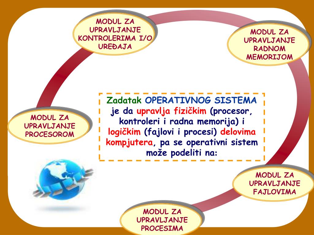 MODUL ZA UPRAVLJANJE KONTROLERIMA I/O UREĐAJA MODUL ZA UPRAVLJANJE PROCESOROM MODUL ZA UPRAVLJANJE RADNOM MEMORIJOM MODUL ZA UPRAVLJANJE FAJLOVIMA MODUL ZA UPRAVLJANJE PROCESIMA ZadatakOPERATIVNOG SISTEMA je da upravlja fizičkim(procesor, kontroleri i radna memorija) i logičkim(fajlovi i procesi) delovima kompjutera,pa se operativni sistem može podeliti na:
