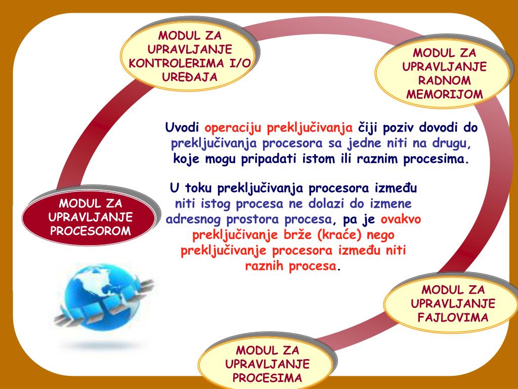 MODUL ZA UPRAVLJANJE KONTROLERIMA I/O UREĐAJA MODUL ZA UPRAVLJANJE RADNOM MEMORIJOM MODUL ZA UPRAVLJANJE FAJLOVIMA MODUL ZA UPRAVLJANJE PROCESIMA MODUL ZA UPRAVLJANJE PROCESOROM Uvodi operaciju preključivanjačiji poziv dovodi do preključivanja procesora sa jedne niti na drugu, koje mogu pripadati istom ili raznim procesima. U toku preključivanja procesora između niti istog procesa ne dolazi do izmene adresnog prostora procesa, pa je ovakvo preključivanje brže (kraće) nego preključivanje procesora između niti raznih procesa.