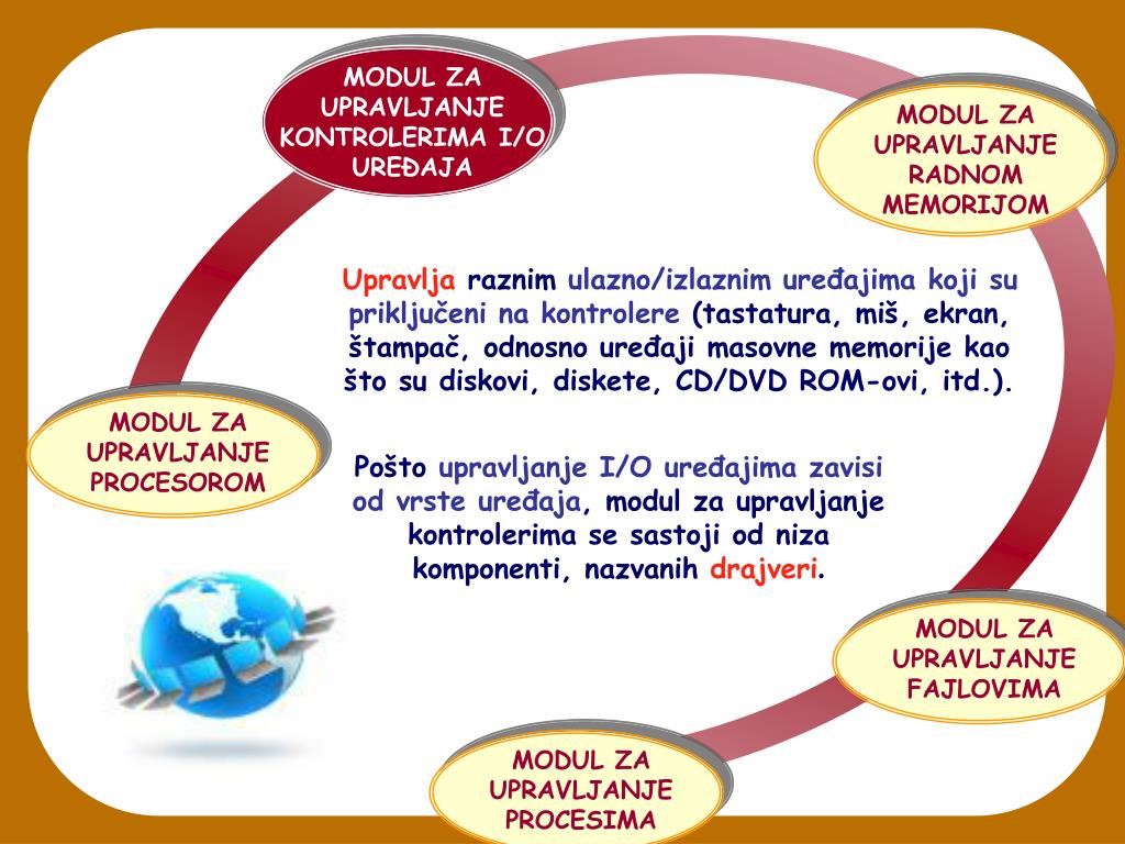 MODUL ZA UPRAVLJANJE KONTROLERIMA I/O UREĐAJA MODUL ZA UPRAVLJANJE PROCESOROM MODUL ZA UPRAVLJANJE RADNOM MEMORIJOM MODUL ZA UPRAVLJANJE FAJLOVIMA MODUL ZA UPRAVLJANJE PROCESIMA Upravlja raznim ulazno/izlaznim uređajima koji su priključeni na kontrolere (tastatura, miš, ekran, štampač, odnosno uređaji masovne memorije kao što su diskovi, diskete, CD/DVD ROM-ovi, itd.). Pošto upravljanje I/O uređajima zavisi od vrste uređaja, modul za upravljanje kontrolerima se sastoji od niza komponenti, nazvanih drajveri.
