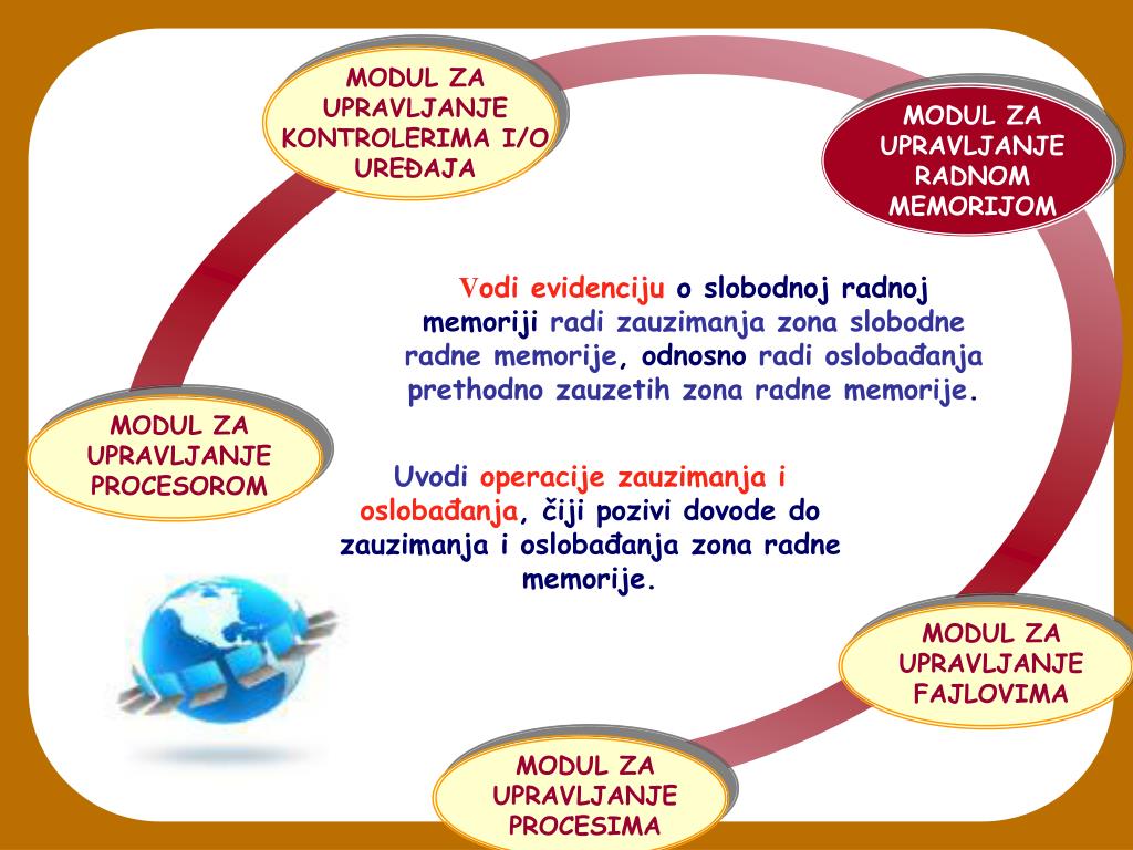 MODUL ZA UPRAVLJANJE RADNOM MEMORIJOM MODUL ZA UPRAVLJANJE KONTROLERIMA I/O UREĐAJA MODUL ZA UPRAVLJANJE PROCESOROM MODUL ZA UPRAVLJANJE FAJLOVIMA MODUL ZA UPRAVLJANJE PROCESIMA Vodi evidenciju o slobodnoj radnoj memoriji radi zauzimanja zona slobodne radne memorije, odnosno radi oslobađanja prethodno zauzetih zona radne memorije. Uvodioperacije zauzimanja i oslobađanja, čiji pozivi dovode do zauzimanja i oslobađanja zona radne memorije.