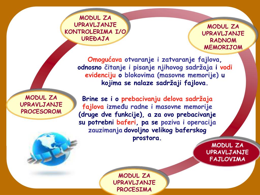 MODUL ZA UPRAVLJANJE KONTROLERIMA I/O UREĐAJA MODUL ZA UPRAVLJANJE PROCESOROM MODUL ZA UPRAVLJANJE RADNOM MEMORIJOM MODUL ZA UPRAVLJANJE PROCESIMA MODUL ZA UPRAVLJANJE FAJLOVIMA Omogućavaotvaranje i zatvaranje fajlova, odnosno čitanje i pisanje njihovog sadržaja i vodi evidenciju o blokovima (masovne memorije) u kojima se nalaze sadržaji fajlova. Brine se i o prebacivanju delova sadržaja fajlovaizmeđu radne i masovne memorije (druge dve funkcije), a za ovo prebacivanje su potrebni baferi, pa se poziva i operacija zauzimanjadovoljno velikog baferskog prostora.