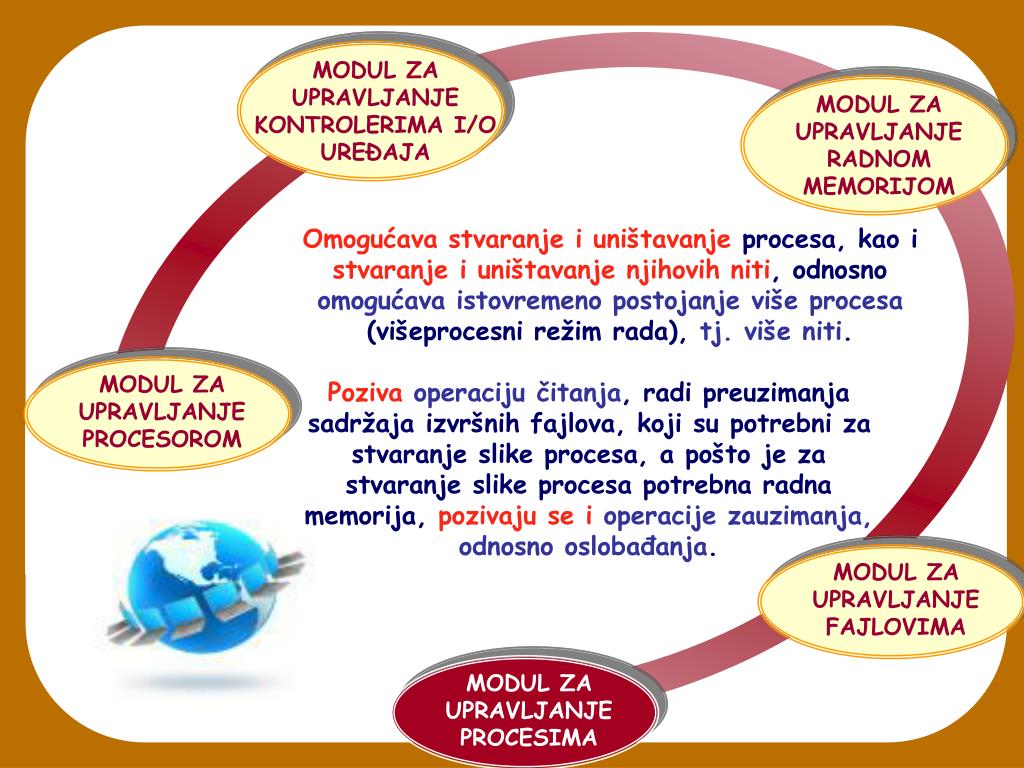MODUL ZA UPRAVLJANJE KONTROLERIMA I/O UREĐAJA MODUL ZA UPRAVLJANJE PROCESOROM MODUL ZA UPRAVLJANJE RADNOM MEMORIJOM MODUL ZA UPRAVLJANJE FAJLOVIMA MODUL ZA UPRAVLJANJE PROCESIMA Omogućava stvaranje i uništavanje procesa, kao i stvaranje i uništavanje njihovih niti,odnosnoomogućava istovremeno postojanje više procesa (višeprocesni režim rada), tj. više niti. Pozivaoperaciju čitanja, radi preuzimanja sadržaja izvršnih fajlova, koji su potrebni za stvaranje slike procesa, apošto je za stvaranje slike procesa potrebna radna memorija, pozivaju se ioperacije zauzimanja, odnosno oslobađanja.