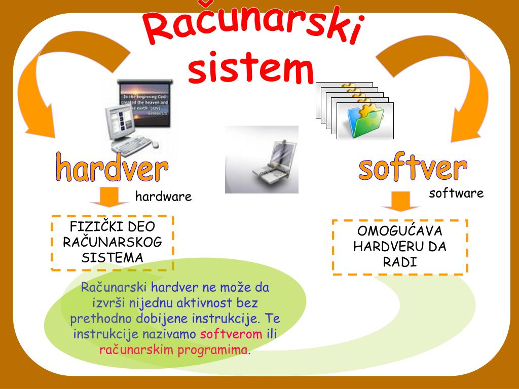 Računarski hardver ne može da izvrši nijednu aktivnost bez prethodno dobijene instrukcije. Te instrukcije nazivamo softverom ili računarskimprogramima. Računarski sistem softver hardver software hardware FIZIČKI DEO RAČUNARSKOG SISTEMA OMOGUĆAVA HARDVERU DA RADI