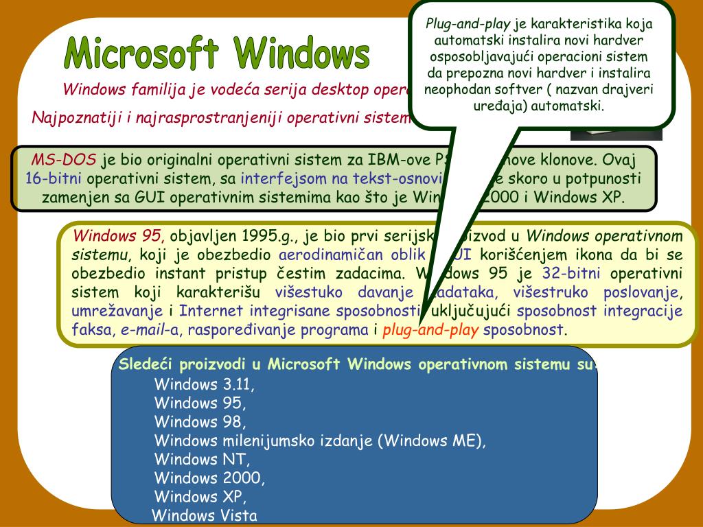 Plug-and-play je karakteristika koja automatski instalira novi hardver osposobljavajući operacioni sistem da prepozna novi hardver i instalira neophodan softver ( nazvan drajveri uređaja) automatski. MS-DOSje bio originalni operativni sistem za IBM-ove PS-e i njihove klonove. Ovaj 16-bitni operativni sistem, sa interfejsom na tekst-osnovi, sada je skoro u potpunosti zamenjen sa GUI operativnim sistemima kao što je Windows 2000 i Windows XP. Windows 95, objavljen 1995.g., je bio prvi serijski proizvod u Windows operativnom sistemu, koji je obezbedio aerodinamičan oblik GUI korišćenjem ikona da bi se obezbedio instant pristup čestim zadacima. Windows 95 je 32-bitni operativni sistem koji karakterišu višestuko davanje zadataka, višestruko poslovanje, umrežavanje i Internet integrisane sposobnosti, uključujući sposobnost integracijefaksa, e-mail-a, raspoređivanje programa i plug-and-play sposobnost. • Sledeći proizvodi u Microsoft Windows operativnom sistemu su: • Windows 3.11, • Windows 95, • Windows 98, • Windows milenijumsko izdanje (Windows ME), • Windows NT, • Windows 2000, • Windows XP, • Windows Vista Microsoft Windows Windows familija je vodeća serija desktop operativnih sistema. Najpoznatiji i najrasprostranjeniji operativni sistem na globalnom nivou