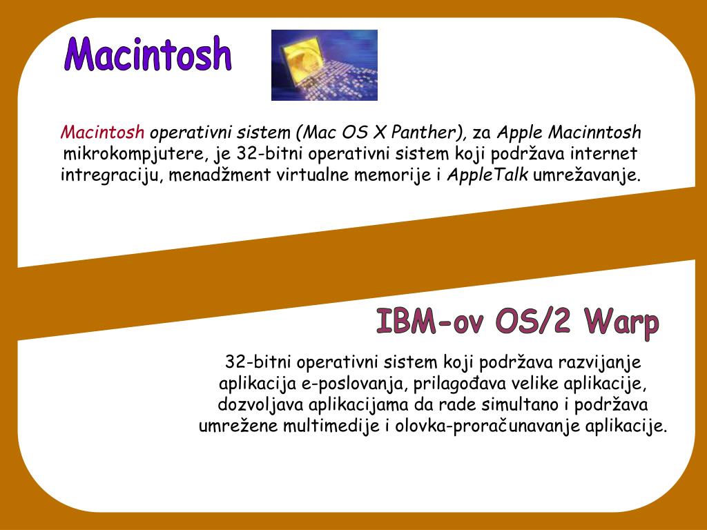 Macintosh Macintosh operativni sistem (Mac OS X Panther), za Apple Macinntosh mikrokompjutere, je 32-bitni operativni sistem koji podržava internet intregraciju, menadžment virtualne memorije i AppleTalk umrežavanje. IBM-ov OS/2 Warp 32-bitni operativni sistem koji podržava razvijanje aplikacija e-poslovanja, prilagođava velike aplikacije, dozvoljava aplikacijama da rade simultano i podržava umrežene multimedije i olovka-proračunavanje aplikacije.