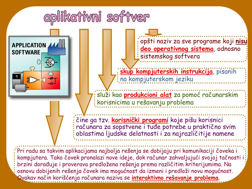 opšti naziv za sve programe koji nisu deo operativnog sistema, odnosno sistemskog softvera skup kompjuterskih instrukcija, pisanih na kompjuterskom jeziku služi kao produkcioni alat za pomoć računarskim korisnicima u rešavanju problema čine ga tzv. korisnički programi koje pišu korisnici računara za sopstvene i tuđe potrebe u praktično svim oblastima ljudske delatnosti i za najrazličitije namene Pri radu sa takvim aplikacijama najbolja rešenja se dobijaju pri komunikaciji čoveka i kompjutera. Tako čovek pronalazi nove ideje, dok računar zahvaljujući svojoj tačnosti i brzini dorađuje i proverava predložena rešenja prema različitim kriterijumima. Na osnovu dobijenih rešenja čovek ima mogućnost da izmeni i predloži novu mogućnost. Ovakav način korišćenja računara naziva se interaktivno rešavanje problema. aplikativni softver