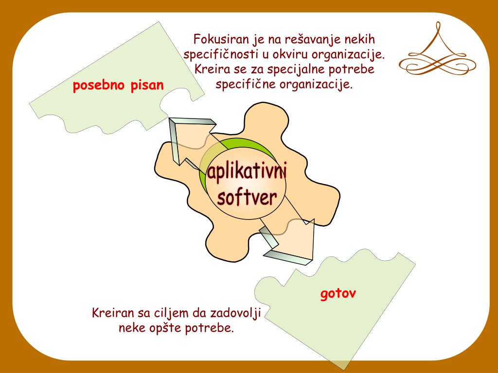 posebno pisan aplikativni softver gotov Fokusiran je na rešavanje nekih specifičnosti u okviru organizacije. Kreira se za specijalne potrebe specifične organizacije. Kreiran sa ciljem da zadovolji neke opšte potrebe.