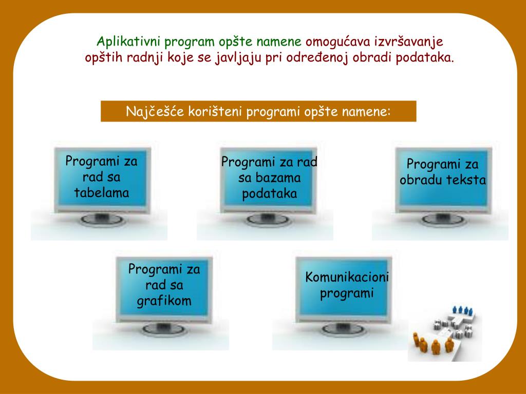 Programi za rad sa tabelama Programi za rad sa bazama podataka Programi za obradu teksta Programi za rad sa grafikom Komunikacioni programi Aplikativni program opšte namene omogućava izvršavanje opštih radnji koje se javljaju pri određenoj obradi podataka. Najčešće korišteni programi opšte namene: