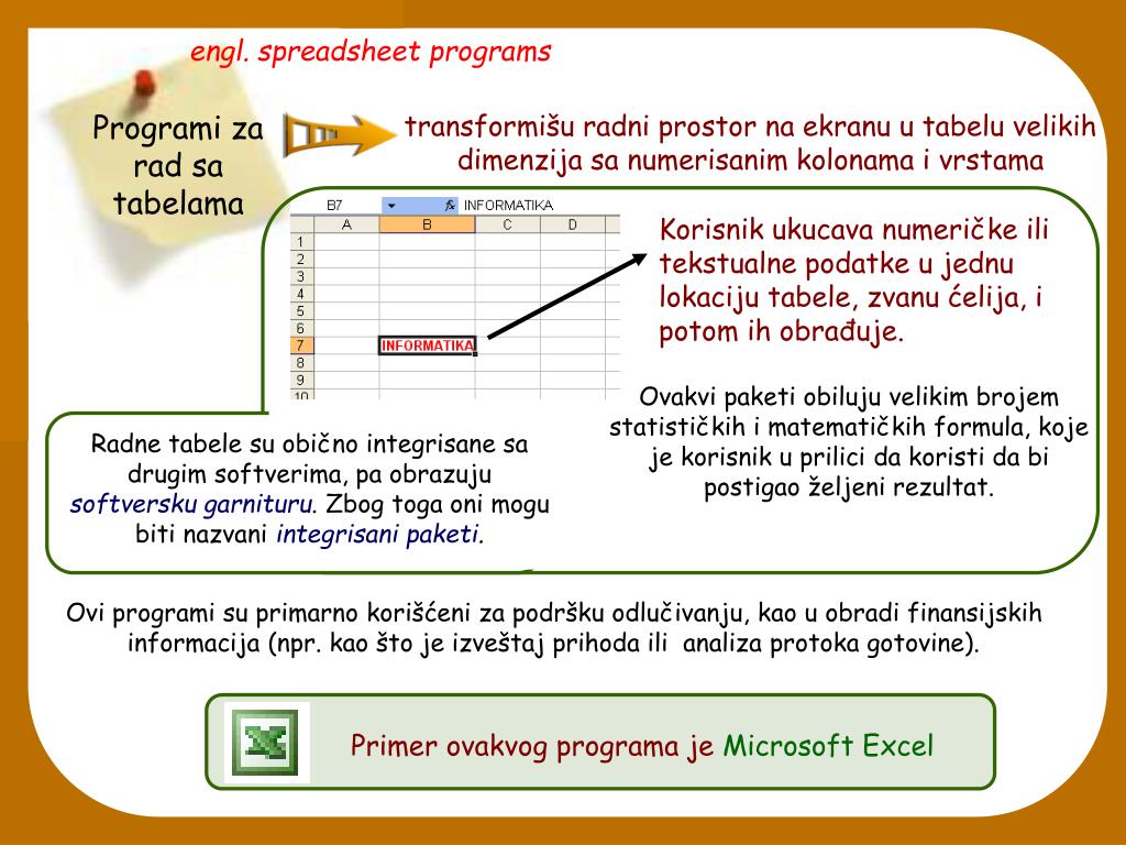 Programi za rad sa tabelama Primer ovakvog programa je Microsoft Excel engl. spreadsheet programs transformišu radni prostor na ekranu u tabelu velikih dimenzija sa numerisanim kolonama i vrstama Korisnik ukucava numeričke ili tekstualne podatke u jednu lokaciju tabele, zvanu ćelija, i potom ih obrađuje. Ovakvi paketi obiluju velikim brojem statističkih i matematičkih formula, koje je korisnik u prilici da koristi da bi postigao željeni rezultat. Radne tabele su obično integrisane sa drugim softverima, pa obrazuju softversku garnituru. Zbog toga oni mogu biti nazvani integrisani paketi. Ovi programi su primarno korišćeni za podršku odlučivanju, kao u obradi finansijskih informacija (npr. kao što je izveštaj prihoda ili analiza protoka gotovine).