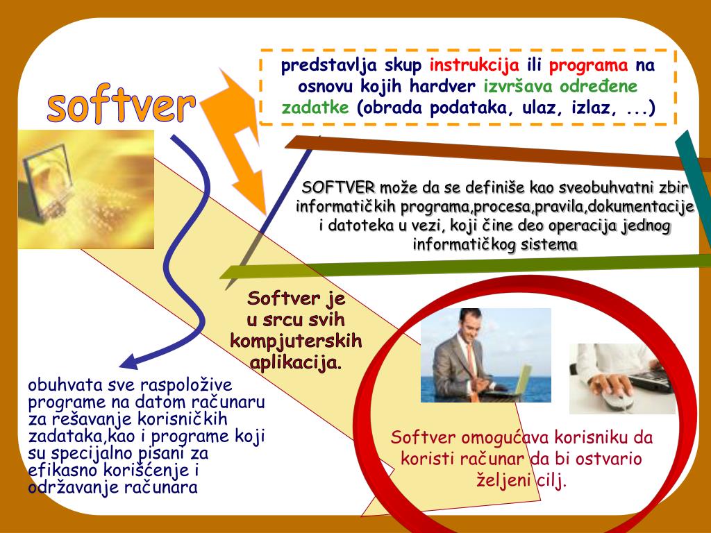 Softver omogućava korisniku da koristi računar da bi ostvario željeni cilj. predstavlja skup instrukcija ili programa na osnovu kojih hardver izvršava određene zadatke (obrada podataka, ulaz, izlaz, ...) softver SOFTVER može da se definiše kao sveobuhvatni zbir informatičkih programa,procesa,pravila,dokumentacije i datoteka u vezi, koji čine deo operacija jednog informatičkog sistema Softver je u srcu svih kompjuterskih aplikacija. obuhvata sve raspoložive programe na datom računaru za rešavanje korisničkih zadataka,kao i programe koji su specijalno pisani za efikasno korišćenje i održavanje računara