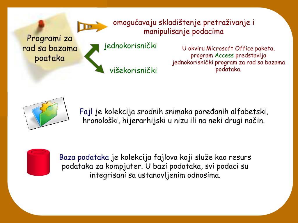 Programi za rad sa bazama poataka omogućavaju skladištenje pretraživanje i manipulisanje podacima jednokorisnički U okviru Microsoft Office paketa, program Access predstavlja jednokorisnički program za rad sa bazama podataka. višekorisnički Fajl je kolekcija srodnih snimaka poređanih alfabetski, hronološki, hijerarhijski u nizu ili na neki drugi način. Baza podataka je kolekcija fajlova koji služe kao resurs podataka za kompjuter. U bazi podataka, svi podaci su integrisani sa ustanovljenim odnosima.