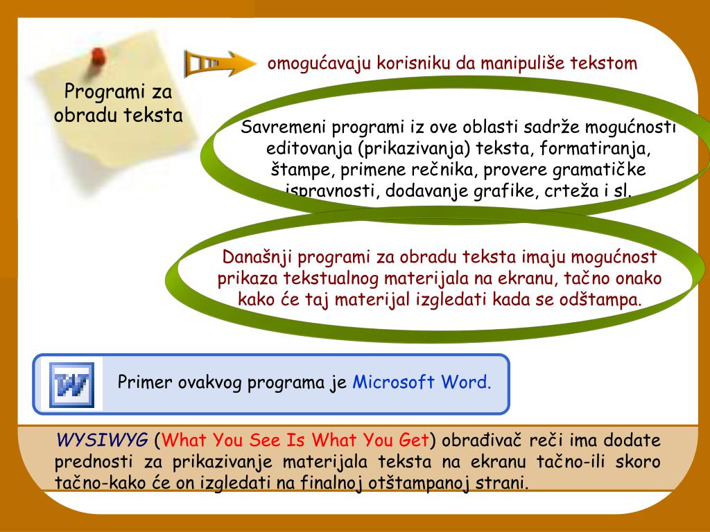Programi za obradu teksta Savremeni programi iz ove oblasti sadrže mogućnosti editovanja (prikazivanja) teksta, formatiranja, štampe, primene rečnika, provere gramatičke ispravnosti, dodavanje grafike, crteža i sl. Današnji programi za obradu teksta imaju mogućnost prikaza tekstualnog materijala na ekranu, tačno onako kako će taj materijal izgledati kada se odštampa. Primer ovakvog programa jeMicrosoft Word. WYSIWYG(What You See Is What You Get) obrađivač reči ima dodate prednosti za prikazivanje materijala teksta na ekranu tačno-ili skoro tačno-kako će on izgledati na finalnoj otštampanoj strani. omogućavaju korisniku da manipuliše tekstom