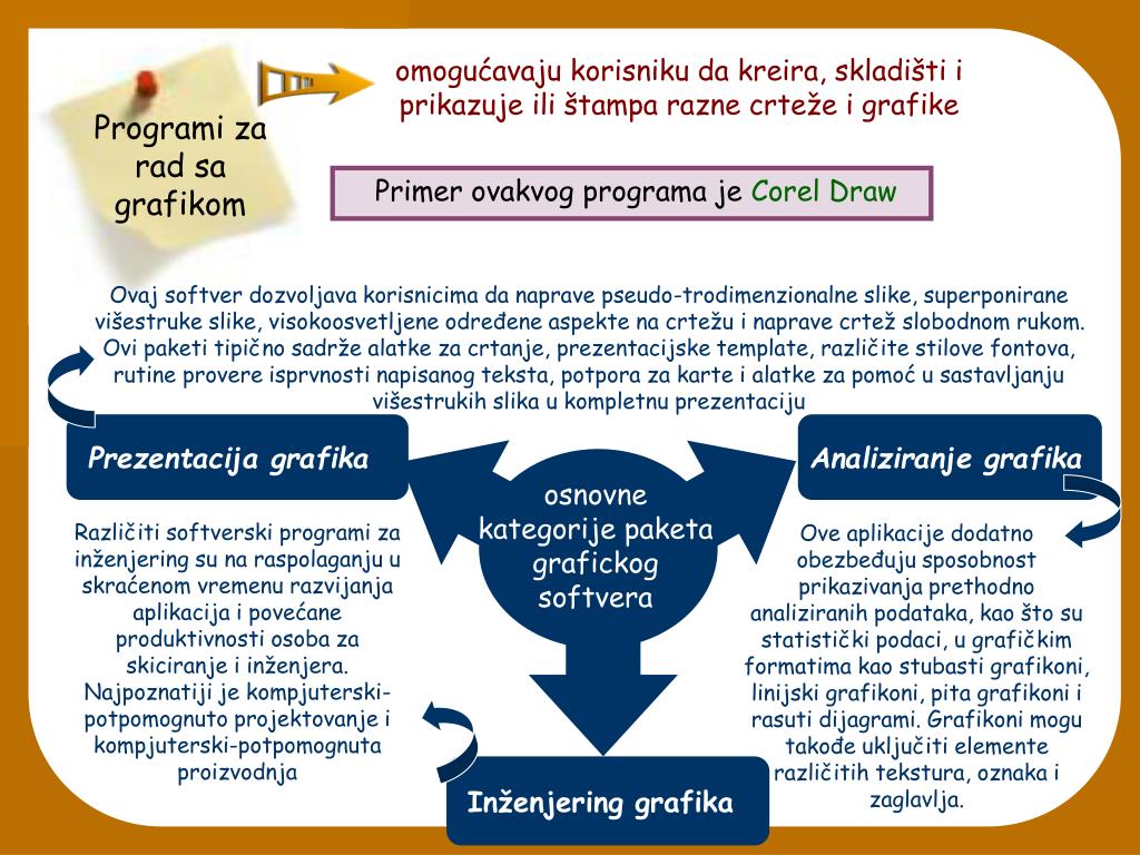 Programi za rad sa grafikom Prezentacija grafika Analiziranje grafika osnovne kategorije paketa grafickog softvera Inženjering grafika omogućavaju korisniku da kreira, skladišti i prikazuje ili štampa razne crteže i grafike Primer ovakvog programa jeCorel Draw Ovaj softver dozvoljava korisnicima da naprave pseudo-trodimenzionalne slike, superponirane višestruke slike, visokoosvetljene određene aspekte na crtežu i naprave crtež slobodnom rukom. Ovi paketi tipično sadrže alatke za crtanje, prezentacijske template, različite stilove fontova, rutine provere isprvnosti napisanog teksta, potpora za karte i alatke za pomoć u sastavljanju višestrukih slika u kompletnu prezentaciju Različiti softverski programi za inženjering su na raspolaganju u skraćenom vremenu razvijanja aplikacija i povećane produktivnosti osoba za skiciranje i inženjera. Najpoznatiji je kompjuterski-potpomognuto projektovanje i kompjuterski-potpomognuta proizvodnja Ove aplikacije dodatno obezbeđuju sposobnost prikazivanja prethodno analiziranih podataka, kao što su statistički podaci, u grafičkim formatima kao stubasti grafikoni, linijski grafikoni, pita grafikoni i rasuti dijagrami. Grafikoni mogu takođe uključiti elemente različitih tekstura, oznaka i zaglavlja.