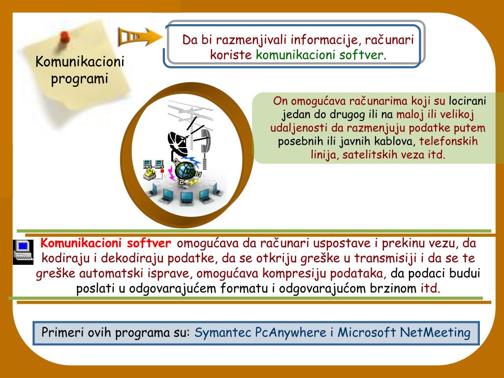 Da bi razmenjivali informacije, računari koriste komunikacioni softver. Komunikacioni programi On omogućava računarima koji su locirani jedan do drugog ili na maloj ili velikoj udaljenosti da razmenjuju podatke putem posebnih ili javnih kablova, telefonskih linija, satelitskih veza itd. Komunikacioni softver omogućava da računari uspostave i prekinu vezu, da kodiraju i dekodiraju podatke, da se otkriju greške u transmisiji i da se te greške automatski isprave, omogućava kompresiju podataka, da podaci budui poslati u odgovarajućem formatu i odgovarajućom brzinom itd. Primeri ovih programa su:Symantec PcAnywhere i Microsoft NetMeeting