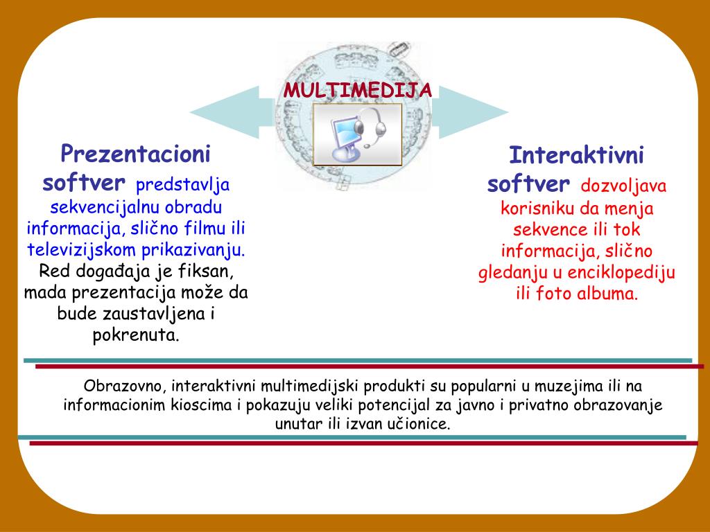 MULTIMEDIJA Prezentacioni softverpredstavlja sekvencijalnu obradu informacija, slično filmu ili televizijskom prikazivanju. Red događaja je fiksan, mada prezentacija može da bude zaustavljena i pokrenuta. Interaktivni softverdozvoljava korisniku da menja sekvence ili tok informacija, slično gledanju u enciklopediju ili foto albuma. Obrazovno, interaktivni multimedijski produkti su popularni u muzejima ili na informacionim kioscima i pokazuju veliki potencijal za javno i privatno obrazovanje unutar ili izvan učionice.