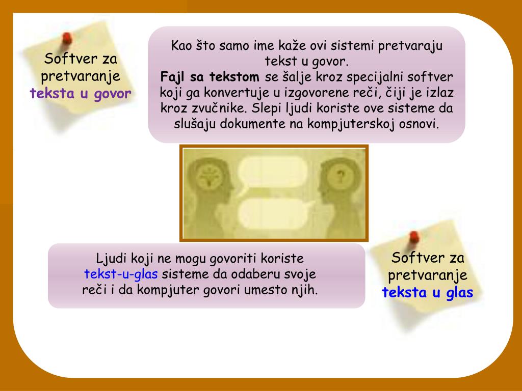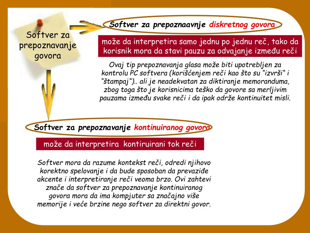 Softver za prepoznaavnje diskretnog govora Softver za prepoznavanje govora Softver za prepoznavanje kontinuiranog govora može da interpretira samo jednu po jednu reč, tako da korisnik mora da stavi pauzu za odvajanje između reči Ovaj tip prepoznavanja glasa može biti upotrebljen za kontrolu PC softvera (korišćenjem reči kao što su “izvrši“ i “štampaj“).. ali je neadekvatan za diktiranje memoranduma, zbog toga što je korisnicima teško da govore sa merljivim pauzama između svake reči i da ipak održe kontinuitet misli. može da interpretira kontiruirani tok reči Softver mora da razume kontekst reči, odredi njihovo korektno spelovanje i da bude sposoban da prevaziđe akcente i interpretiranje reči veoma brzo. Ovi zahtevi znače da softver za prepoznavanje kontinuiranog govora mora da ima kompjuter sa značajno više memorije i veće brzine nego softver za direktni govor.