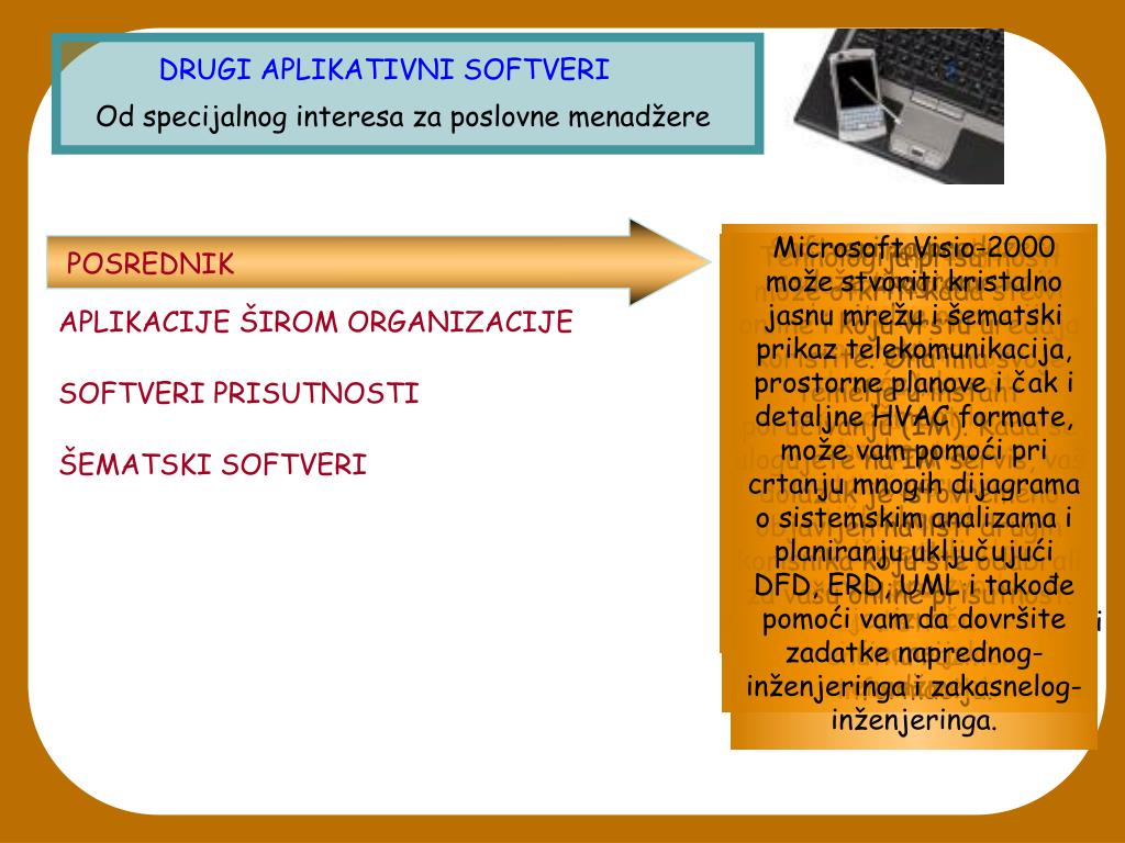Tehnologija prisutnosti može otkriti kada ste vi online i koju vrstu uređaja koristite. Ona ima svoje temelje u instant poručivanju (IM). Kada se ulogujete na IM servis, vaš dolazak je istovremeno objavljen na listi drugih korisnika koju ste odabrali za vašu online prisutnost. Microsoft Visio-2000 može stvoriti kristalno jasnu mrežu i šematski prikaz telekomunikacija, prostorne planove i čak i detaljne HVAC formate, može vam pomoći pri crtanju mnogih dijagrama o sistemskim analizama i planiranju uključujući DFD, ERD, UML i takođe pomoći vam da dovršite zadatke naprednog-inženjeringa i zakasnelog-inženjeringa. Softver napravljen da poveže aplikacione module razvijene na različitim kompjuterskim jezicima i koji rade na heterogenim platformama, bilo na jednoj mašini ili preko mreže. Posrednik čuva putanju za lokaciju softverskih modula koje je potrebno povezati jedan sa drugim preko sistema za distribuciju i vodi trenutnu razmenu informacija. Softveri za preduzeća sadrže programe koji vode vitalne operacije za organizaciju (preduzeće), kao što je menadžment lanca nabavke, popuna inventara, naručivanje, logistička koordinacija, menadžment ljudskih resursa, proizvodnja, operacije, izračunavanje i finansijski menadžment. DRUGI APLIKATIVNI SOFTVERI Od specijalnog interesa za poslovne menadžere POSREDNIK APLIKACIJE ŠIROM ORGANIZACIJE SOFTVERI PRISUTNOSTI ŠEMATSKI SOFTVERI