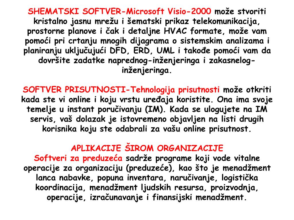 SHEMATSKI SOFTVER-Microsoft Visio-2000 može stvoriti kristalno jasnu mrežu i šematski prikaz telekomunikacija, prostorne planove i čak i detaljne HVAC formate, može vam pomoći pri crtanju mnogih dijagrama o sistemskim analizama i planiranju uključujući DFD, ERD, UML i takođe pomoći vam da dovršite zadatke naprednog-inženjeringa i zakasnelog-inženjeringa.SOFTVER PRISUTNOSTI-Tehnologija prisutnosti može otkriti kada ste vi online i koju vrstu uređaja koristite. Ona ima svoje temelje u instant poručivanju (IM). Kada se ulogujete na IM servis, vaš dolazak je istovremeno objavljen na listi drugih korisnika koju ste odabrali za vašu online prisutnost. APLIKACIJE ŠIROM ORGANIZACIJESoftveri za preduzeća sadrže programe koji vode vitalne operacije za organizaciju (preduzeće), kao što je menadžment lanca nabavke, popuna inventara, naručivanje, logistička koordinacija, menadžment ljudskih resursa, proizvodnja, operacije, izračunavanje i finansijski menadžment.