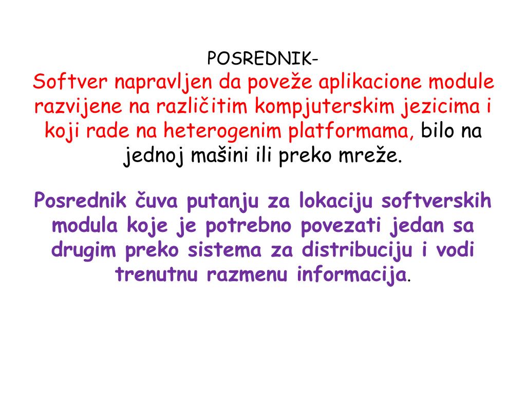 POSREDNIK-Softver napravljen da poveže aplikacione module razvijene na različitim kompjuterskim jezicima i koji rade na heterogenim platformama, bilo na jednoj mašini ili preko mreže. Posrednik čuva putanju za lokaciju softverskih modula koje je potrebno povezati jedan sa drugim preko sistema za distribuciju i vodi trenutnu razmenu informacija.