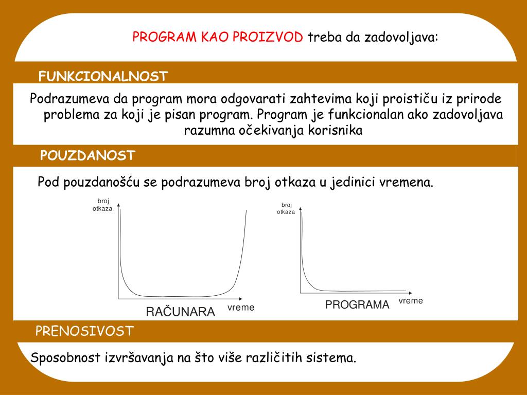 FUNKCIONALNOST POUZDANOST PRENOSIVOST PROGRAM KAO PROIZVODtreba da zadovoljava: Podrazumeva da program mora odgovarati zahtevima koji proističu iz prirode problema za koji je pisan program. Program je funkcionalan ako zadovoljava razumna očekivanja korisnika Pod pouzdanošću se podrazumeva broj otkaza u jedinici vremena. Sposobnost izvršavanja na što više različitih sistema.