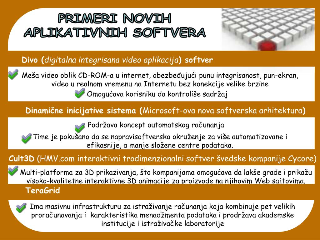 Divo (digitalna integrisana video aplikacija) softver Dinamične inicijative sistema (Microsoft-ova nova softverska arhitektura) Cult3D (HMV.com interaktivni trodimenzionalni softver švedske kompanije Cycore) TeraGrid PRIMERI NOVIH APLIKATIVNIH SOFTVERA Meša video oblik CD-ROM-a u internet, obezbeđujući punu integrisanost, pun-ekran, video u realnom vremenu na Internetu bez konekcije velike brzine Omogućava korisniku da kontroliše sadržaj Podržava koncept automatskog računanja Time je pokušano da se napravisoftversko okruženje za više automatizovane i efikasnije, a manje složene centre podataka. Multi-platforma za 3D prikazivanja, što kompanijama omogućava da lakše grade i prikažu visoko-kvalitetne interaktivne 3D animacije za proizvode na njihovim Web sajtovima. Ima masivnu infrastrukturu za istraživanje računanja koja kombinuje pet velikih proračunavanja i karakteristika menadžmenta podataka i prodržava akademske institucije i istraživačke laboratorije