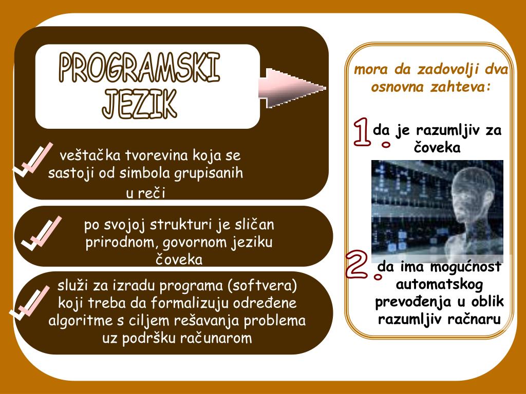 PROGRAMSKI JEZIK 1. da je razumljiv za čoveka veštačka tvorevina koja se sastoji od simbola grupisanih u reči po svojoj strukturi je sličan prirodnom, govornom jeziku čoveka služi za izradu programa (softvera) koji treba da formalizuju određene algoritme s ciljem rešavanja problema uz podršku računarom 2. da ima mogućnost automatskog prevođenja u oblik razumljiv račnaru mora da zadovolji dva osnovna zahteva: