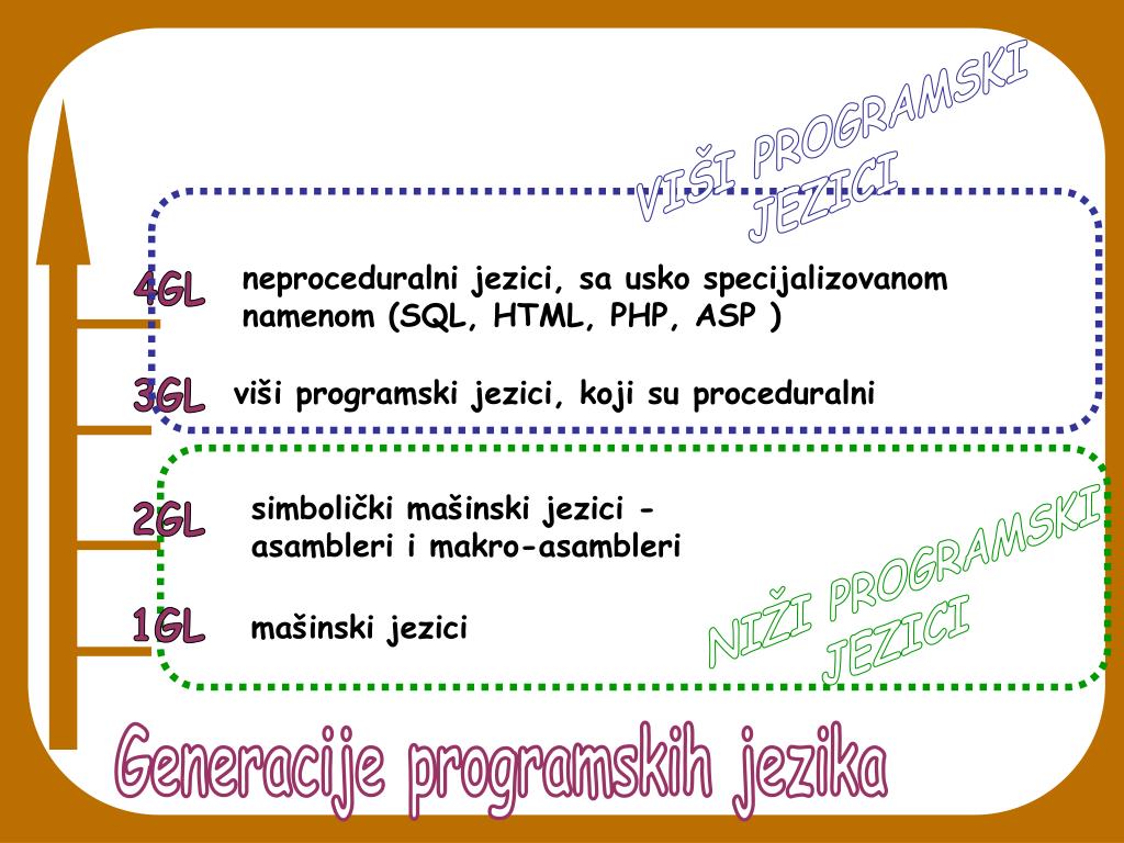 neproceduralni jezici, sa usko specijalizovanom namenom(SQL, HTML, PHP, ASP ) 4GL viši programski jezici, koji su proceduralni 3GL simbolički mašinski jezici - asambleri i makro-asambleri 2GL mašinski jezici 1GL VIŠI PROGRAMSKI JEZICI NIŽI PROGRAMSKI JEZICI Generacije programskih jezika