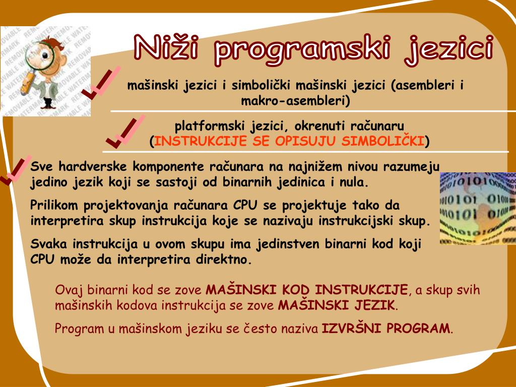 Niži programski jezici mašinski jezici i simbolički mašinski jezici (asembleri i makro-asembleri) platformski jezici, okrenuti računaru (INSTRUKCIJE SE OPISUJU SIMBOLIČKI) Sve hardverske komponente računara na najnižem nivou razumeju jedino jezik koji se sastoji od binarnih jedinica i nula. Prilikom projektovanja računara CPU se projektuje tako da interpretira skup instrukcija koje se nazivaju instrukcijski skup. Svaka instrukcija u ovom skupu ima jedinstven binarni kod koji CPU može da interpretira direktno. Ovaj binarni kod se zove MAŠINSKI KOD INSTRUKCIJE, a skup svih mašinskih kodova instrukcija se zove MAŠINSKI JEZIK. Program u mašinskom jeziku se često naziva IZVRŠNI PROGRAM.