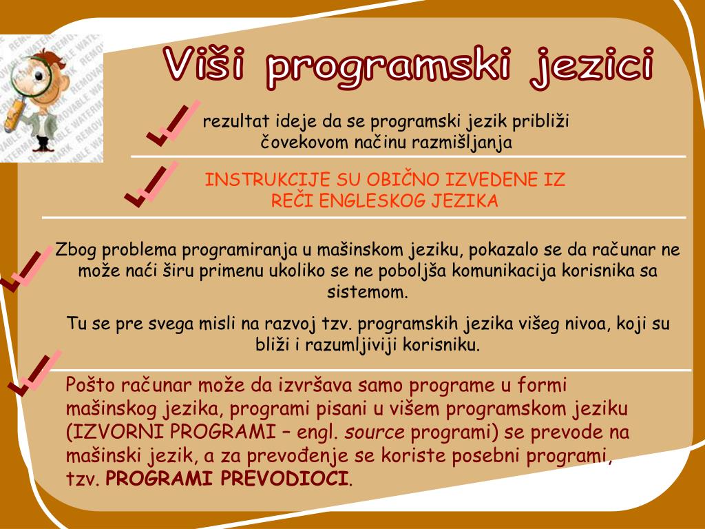 Viši programski jezici rezultat ideje da se programski jezik približi čovekovom načinu razmišljanja INSTRUKCIJE SU OBIČNO IZVEDENE IZ REČI ENGLESKOG JEZIKA Zbog problema programiranja u mašinskom jeziku, pokazalo se da računar ne može naći širu primenu ukoliko se ne poboljša komunikacija korisnika sa sistemom. Tu se pre svega misli na razvoj tzv. programskih jezika višeg nivoa, koji su bliži i razumljiviji korisniku. Pošto računar može da izvršava samo programe u formi mašinskog jezika, programi pisani u višem programskom jeziku (IZVORNI PROGRAMI – engl. source programi) se prevode na mašinski jezik, a za prevođenje se koriste posebni programi, tzv. PROGRAMI PREVODIOCI.