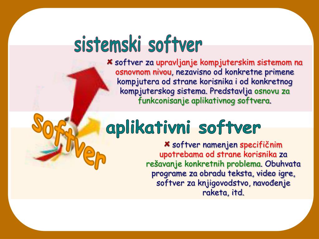 softver sistemski softver • softver za upravljanje kompjuterskim sistemom na osnovnom nivou, nezavisno od konkretne primene kompjutera od strane korisnika i od konkretnog kompjuterskog sistema. Predstavlja osnovu za funkconisanje aplikativnog softvera. aplikativni softver • softver namenjen specifičnim upotrebama od strane korisnika za rešavanje konkretnih problema. Obuhvata programe za obradu teksta, video igre, softver za knjigovodstvo, navođenje raketa, itd.