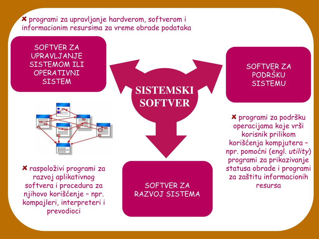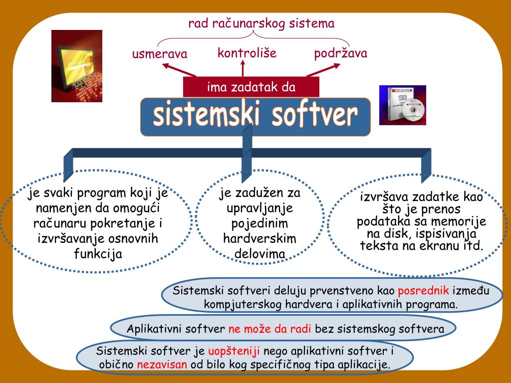sistemski softver je svaki programkoji je namenjenda omogući računaru pokretanje i izvršavanje osnovnih funkcija je zadužen za upravljanje pojedinim hardverskim delovima izvršava zadatke kao što je prenos podataka sa memorije na disk, ispisivanja teksta na ekranu itd. Sistemski softveri deluju prvenstveno kao posrednik između kompjuterskog hardvera i aplikativnih programa. Aplikativni softver ne može da radi bez sistemskog softvera Sistemski softver je uopšteniji nego aplikativni softver i obično nezavisan od bilo kog specifičnog tipa aplikacije. rad računarskog sistema kontroliše podržava usmerava ima zadatak da