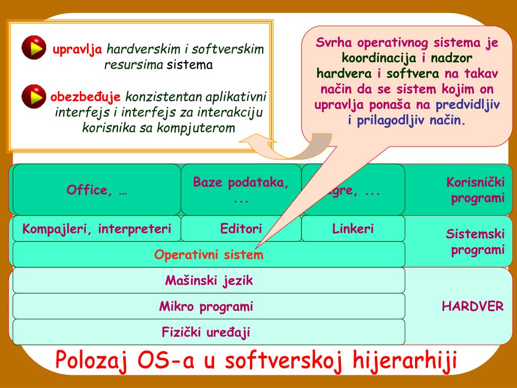 upravljahardverskim i softverskim resursima sistema obezbeđujekonzistentan aplikativni interfejs i interfejs za interakciju korisnika sa kompjuterom Svrha operativnog sistema je koordinacija i nadzorhardvera i softvera na takav način da se sistem kojim on upravlja ponaša na predvidljiv i prilagodljiv način. Korisnički programi Office, … Baze podataka, ... Igre, ... Sistemski programi Kompajleri, interpreteri Editori Linkeri Operativni sistem HARDVER Mašinski jezik Mikro programi Fizički uređaji Polozaj OS-a u softverskoj hijerarhiji