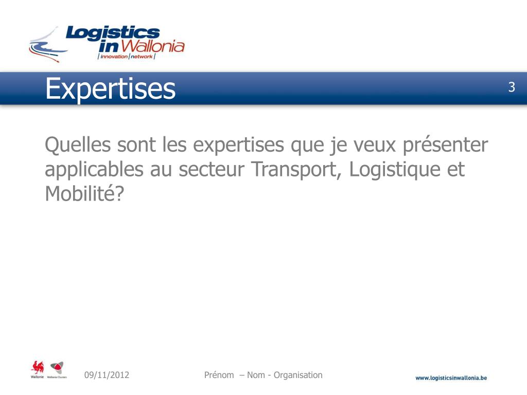 Expertises Quelles sont les expertises que je veux présenter applicables au secteur Transport, Logistique et Mobilité? Prénom – Nom - Organisation