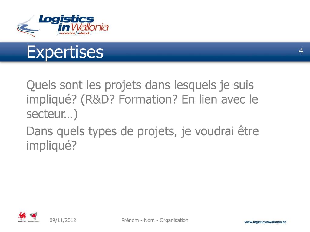 Expertises Quels sont les projets dans lesquels je suis impliqué? (R&D? Formation? En lien avec le secteur…) Dans quels types de projets, je voudrai être impliqué? Prénom - Nom - Organisation
