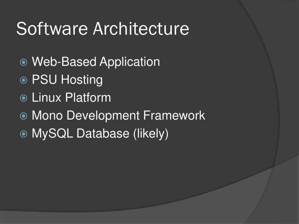 Software Architecture • Web-Based Application • PSU Hosting • Linux Platform • Mono Development Framework • MySQL Database (likely)