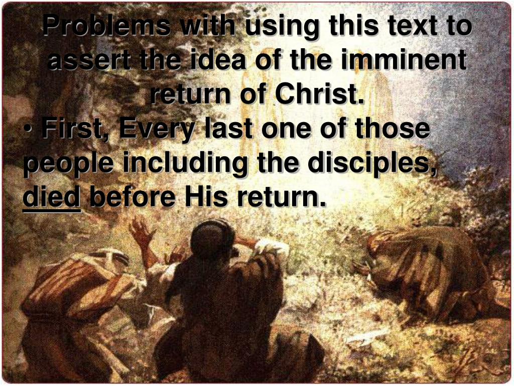 Problems with using this text to assert the idea of the imminent return of Christ. First, Every last one of those people including the disciples, died before His return.