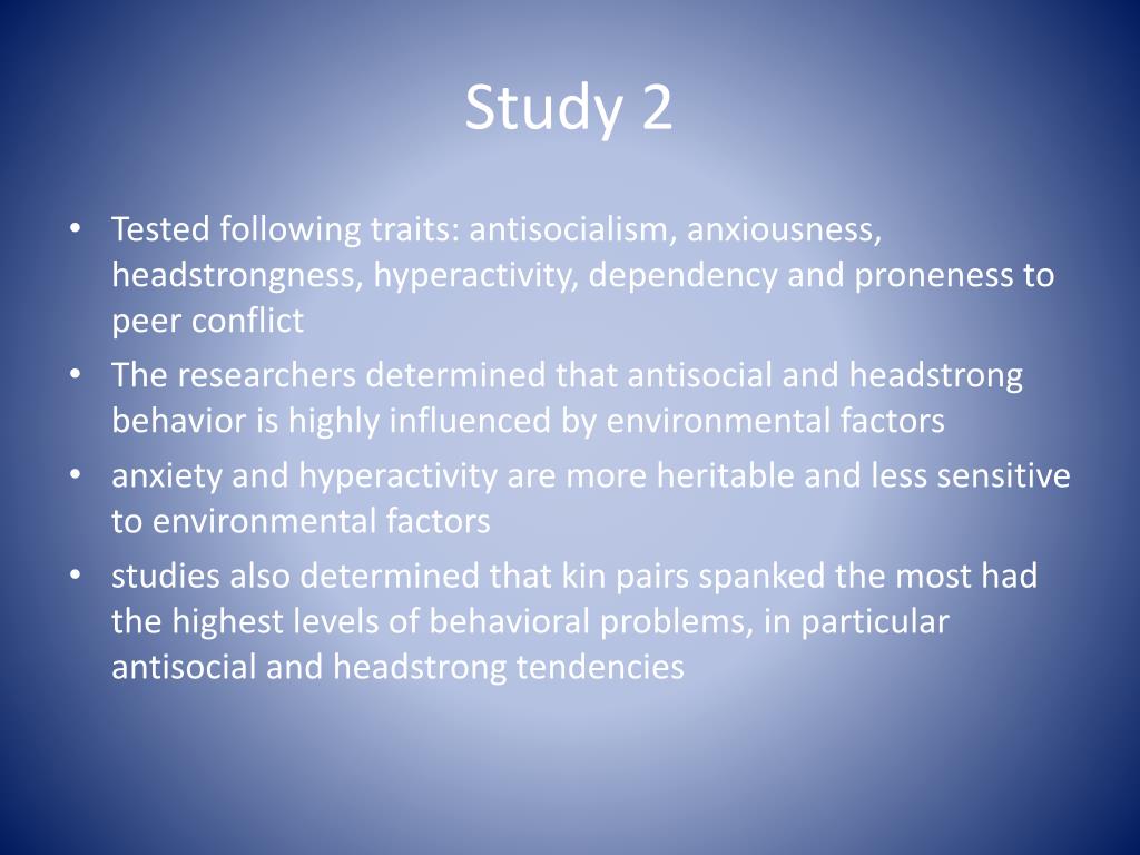 Study 2 • Tested following traits: antisocialism, anxiousness, headstrongness, hyperactivity, dependency and proneness to peer conflict • The researchers determined that antisocial and headstrong behavior is highly influenced by environmental factors • anxiety and hyperactivity are more heritable and less sensitive to environmental factors • studies also determined that kin pairs spanked the most had the highest levels of behavioral problems, in particular antisocial and headstrong tendencies