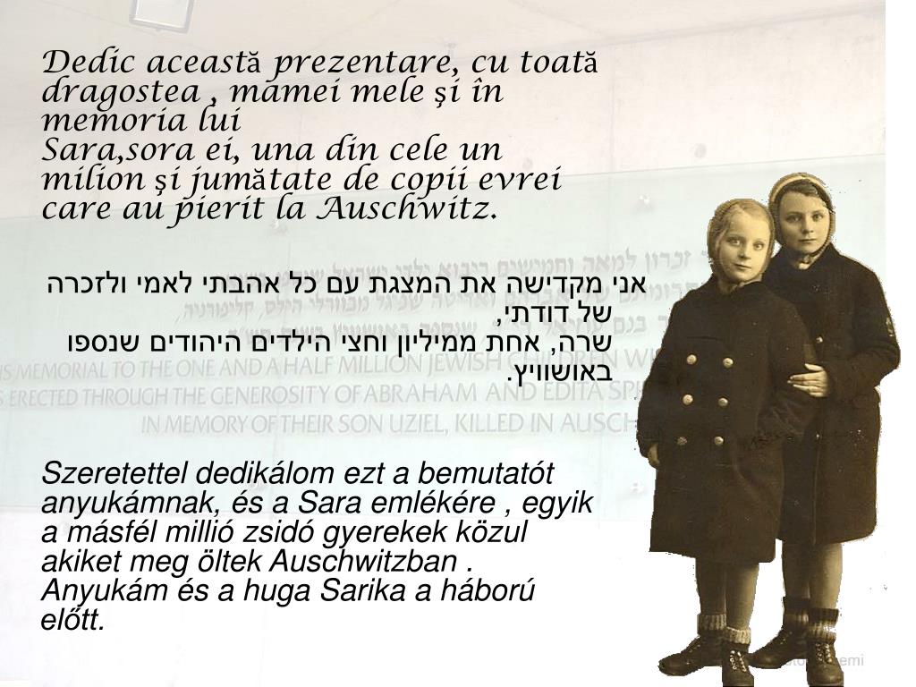 Dedic această prezentare, cu toată dragostea , mamei mele şi în memoria luiSara,sora ei, una din cele un milion şi jumătate de copii evrei care au pierit la Auschwitz. אני מקדישה את המצגת עם כל אהבתי לאמי ולזכרה של דודתי,שרה, אחת ממיליון וחצי הילדים היהודים שנספו באושוויץ. Szeretettel dedikálom ezt a bemutatót anyukámnak, és a Sara emlékére , egyik a másfél millió zsidó gyerekek közul akiket meg öltek Auschwitzban .Anyukám és a huga Sarika a háború előtt.
