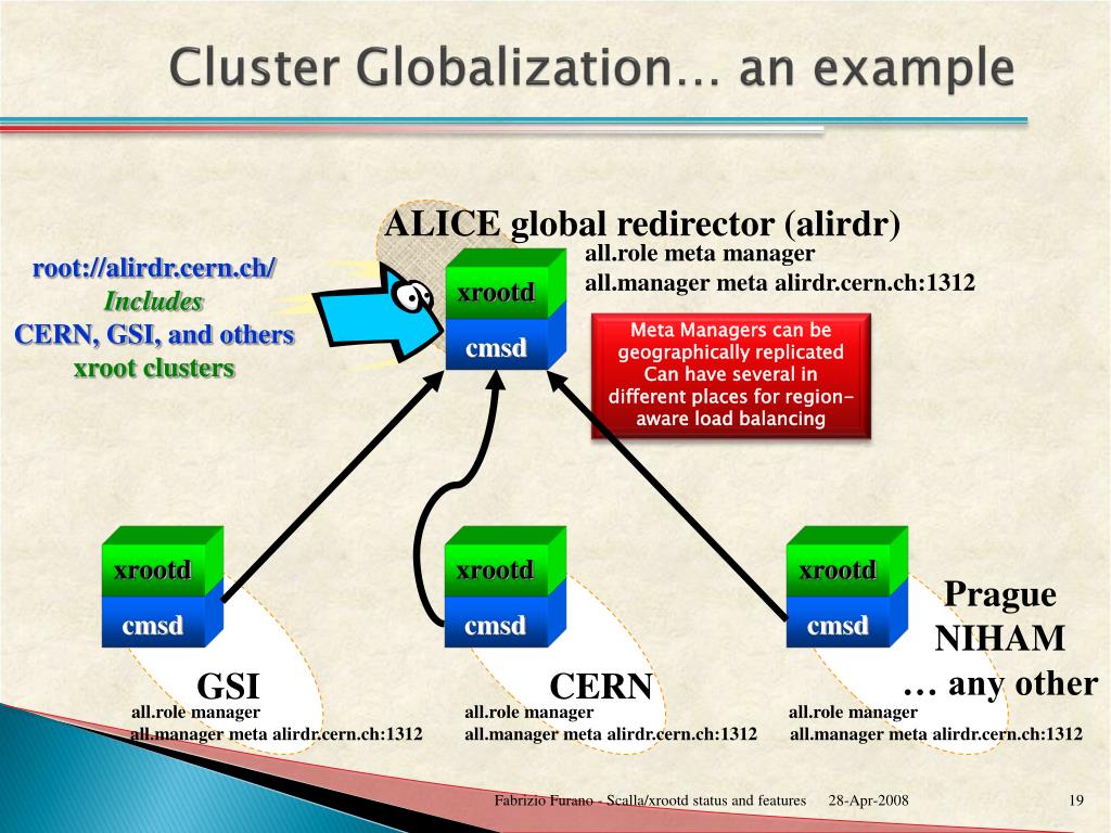 Why Globalize? • Uniform view of participating clusters • Can easily deploy a virtual MSS • Included as part of the existing MPS framework • A subcluster can get data from the metacluster (e.g. missing files) • Try out real time WAN access • You really don’t need data everywhere! • ALICE is moving in this direction • The non-uniform name space is not an obstacle anymore • For historical reasons, a file had different path prefixes and name suffixes • Suffix has been removed • Site-dependent path prefixes are translated correctly now • xrootd-based sites in ALICE will support both • The local historical name space • The uniform global one Fabrizio Furano - Scalla/xrootd status and features