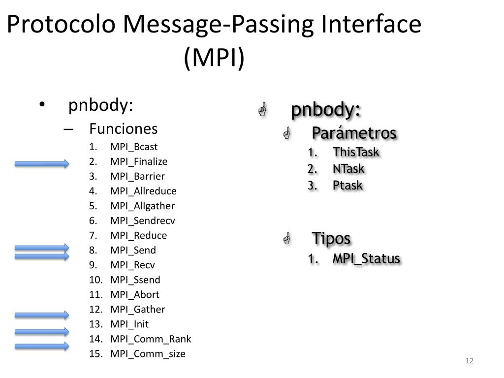 Protocolo Message-Passing Interface (MPI) • pnbody: • Funciones • MPI_Bcast • MPI_Finalize • MPI_Barrier • MPI_Allreduce • MPI_Allgather • MPI_Sendrecv • MPI_Reduce • MPI_Send • MPI_Recv • MPI_Ssend • MPI_Abort • MPI_Gather • MPI_Init • MPI_Comm_Rank • MPI_Comm_size • pnbody: • Parámetros • ThisTask • NTask • Ptask • Tipos • MPI_Status