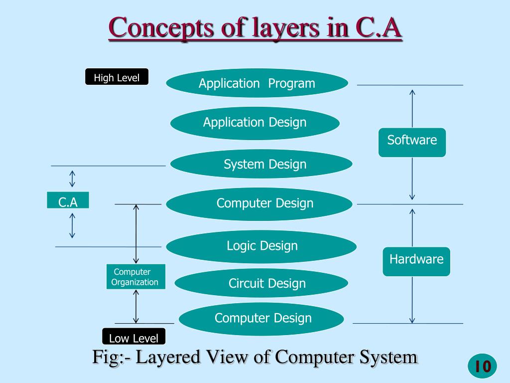 Concepts of layers in C.A High Level Application Program Application Design Fig:- Layered View of Computer System Software System Design Computer Design C.A Logic Design Hardware Computer Organization Circuit Design Computer Design Low Level