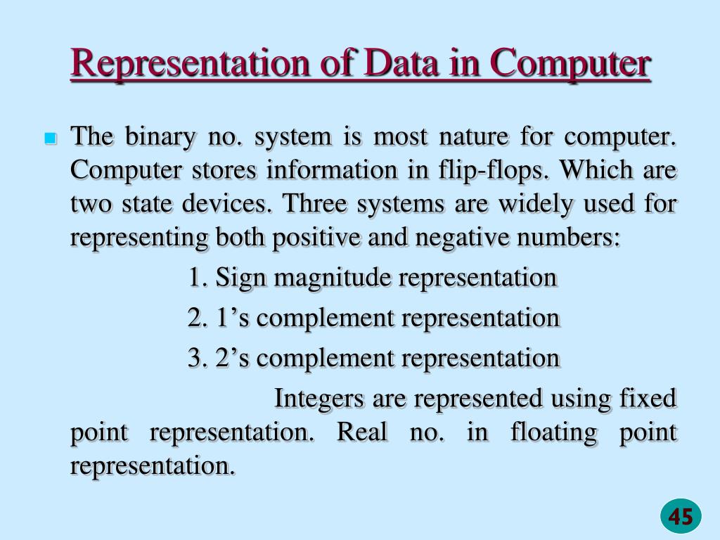 Representation of Data in Computer The binary no. system is most nature for computer. Computer stores information in flip-flops. Which are two state devices. Three systems are widely used for representing both positive and negative numbers: 1. Sign magnitude representation 2. 1’s complement representation 3. 2’s complement representation Integers are represented using fixed point representation. Real no. in floating point representation.