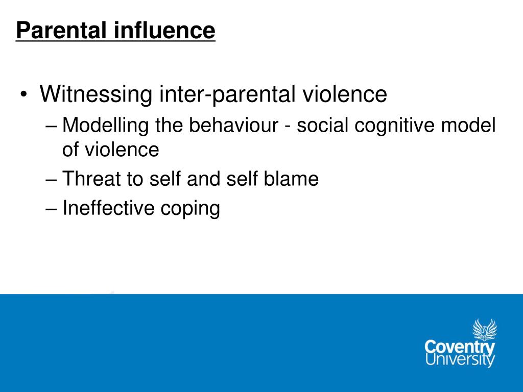 Parental influence • Witnessing inter-parental violence • Modelling the behaviour - social cognitive model of violence • Threat to self and self blame • Ineffective coping