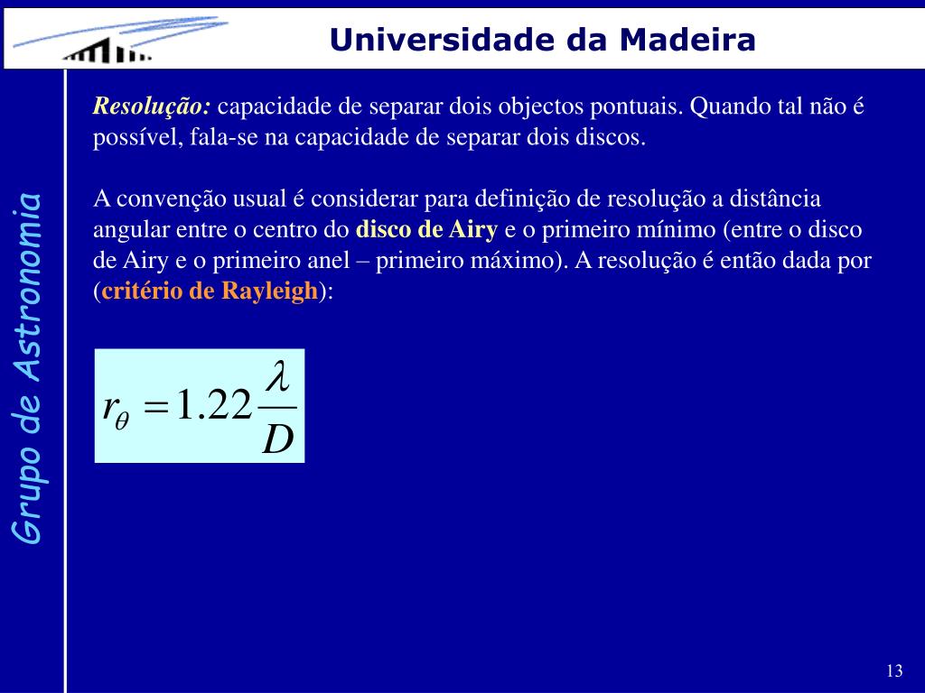 Universidade da Madeira Resolução: capacidade de separar dois objectos pontuais. Quando tal não é possível, fala-se na capacidade de separar dois discos. A convenção usual é considerar para definição de resolução a distância angular entre o centro do disco de Airy e o primeiro mínimo (entre o disco de Airy e o primeiro anel – primeiro máximo). A resolução é então dada por (critério de Rayleigh): Grupo de Astronomia 13