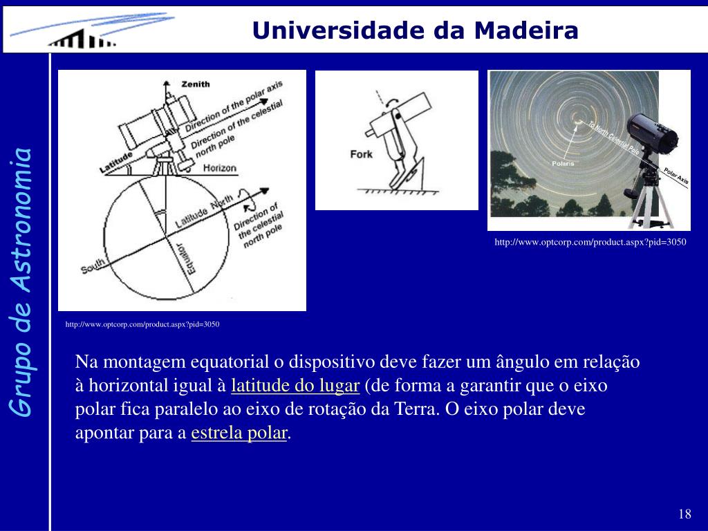 Universidade da Madeira http://www.optcorp.com/product.aspx?pid=3050 Grupo de Astronomia http://www.optcorp.com/product.aspx?pid=3050 Na montagem equatorial o dispositivo deve fazer um ângulo em relação à horizontal igual à latitude do lugar (de forma a garantir que o eixo polar fica paralelo ao eixo de rotação da Terra. O eixo polar deve apontar para a estrela polar. 18